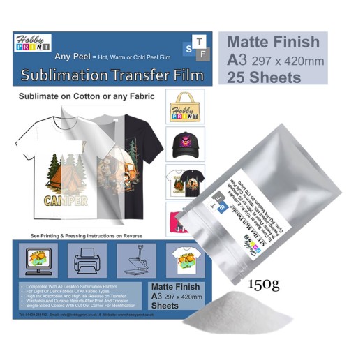 This HobbyPrint® STF (Sublimation to Film) A3 kit enables you to print and press designs directly onto any light-coloured fabrics, cotton, poly-cotton or polyester blends. All Fabrics. The process is the same as normal sublimation printing, but with the addition of a Hot Melt powder step. The kit can also be used on Dark colour fabrics with HTV.